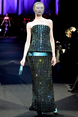 Style.com's Tim Blanks said this: Inspired, he said, by the gleam of gemstones, Armani produced clothes that came from another planet, the same one that Pierre Cardin and Thierry Mugler might have touched down on once. (It's already been suggested its name could be Gaga.) The first outfit—jacket, skirt, and leggings—shimmered around the model's body like liquid mercury. Her metallic saucer of a hat—one of many made by Philip Treacy for the collection—beamed in signals from above. The ensemble set the tone for the sci-fi extravaganza that followed.